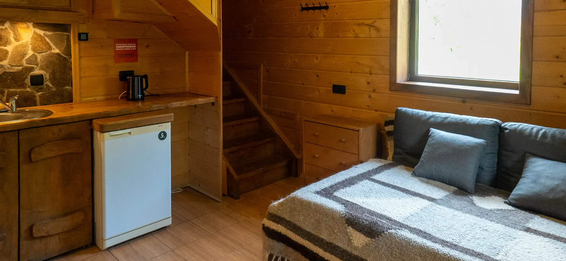 На першому ярусі — кімната з каміном, невеличким кухонним куточком, де можна запарити чай, приготувати салат чи сандвіч. Диван розкладається у зручне двоспальне ліжко.