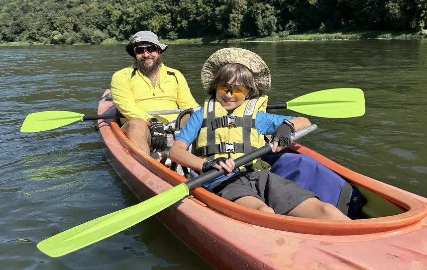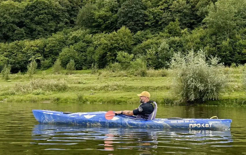 Пройшли десь 13 км на каяках, відвідали водоспад Дівочі сльози та печеру відлюдника. Фінішували в кемпі “Білий Бізон”.