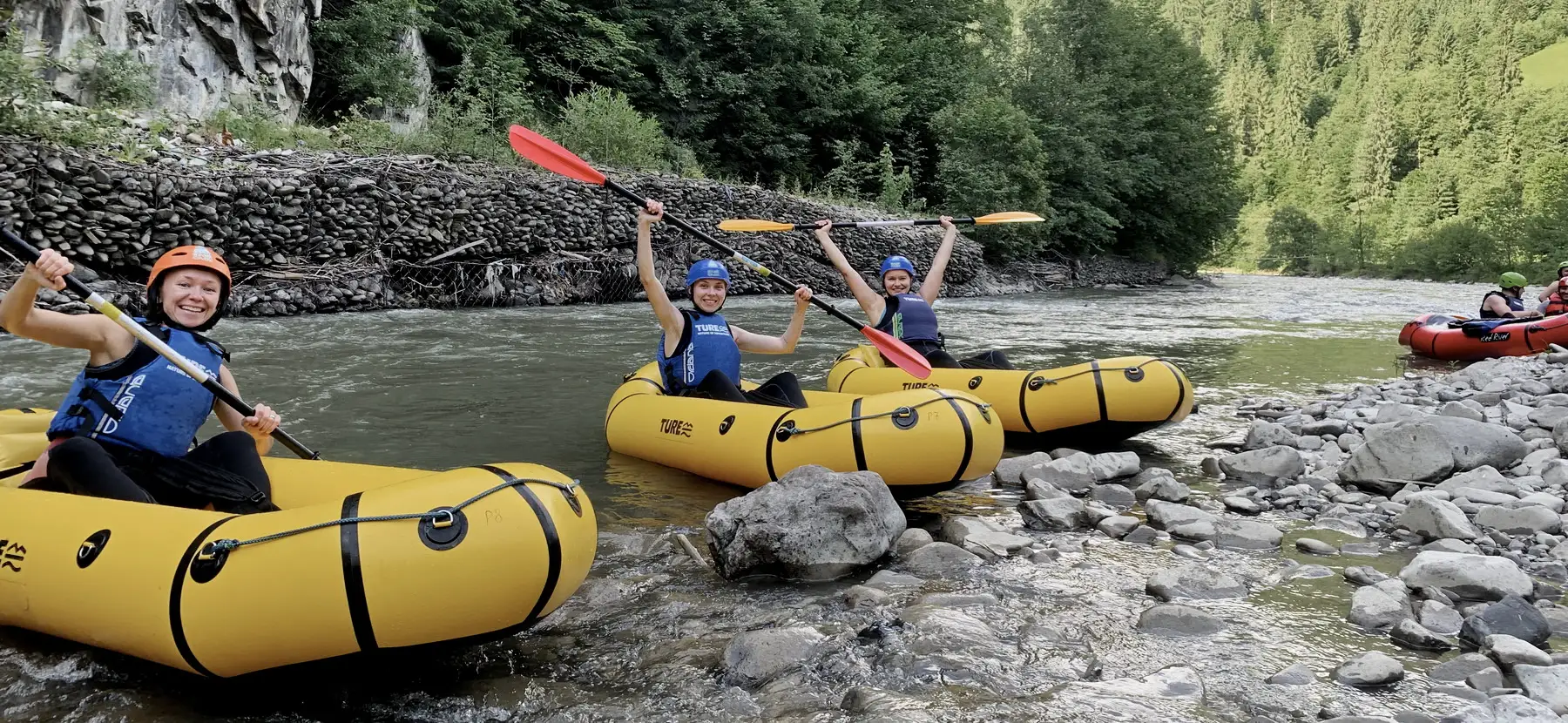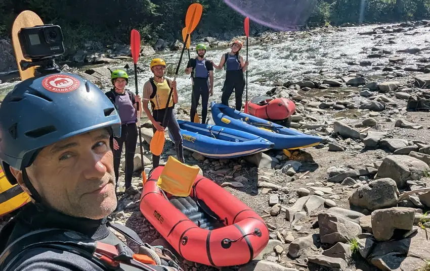 Далі ділимося на екіпажі й сідаємо у човни. Це можуть бути рафти, надувні каяки (одно-, дво- й тримісні), пакрафти. Розподіляючи учасників по човнах, гід враховує досвід, фізичну форму, уподобання та наявність вільних плавзасобів.